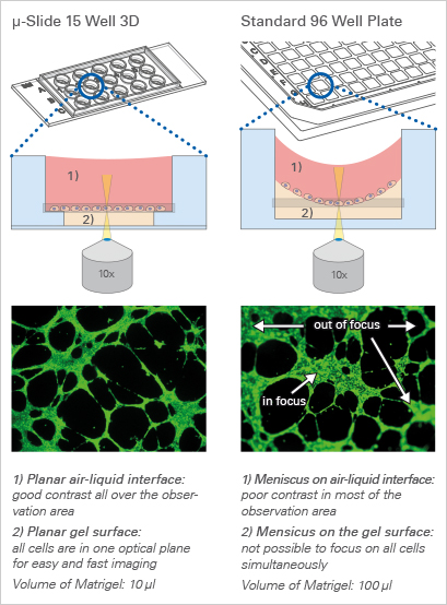 Further, no gel meniscus is formed. This ensures the formation of a uniformly thick gel matrix on which all cells are in one optical plane, creating reproducible cell culture conditions. The μ-Slide 15 Well 3D can be used with all common hydrogel matrices, such as Matrigel?, collagen gels, agarose gels, and hyaluronic acid gels.