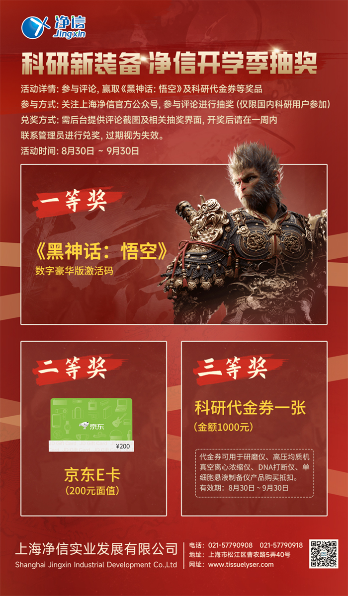 親愛的科研伙伴們,新學期伊始,是不是感覺你的實驗室還缺點什么?上海凈信來幫你補齊裝備!參與我們的開學季抽獎活動,就有機會獲得《黑神話:悟空》數字豪華版激活碼,讓你的科研生活不再單調。不僅如此,還有京東E卡科研代金券等你來拿,讓你的科研之路更加順暢!
