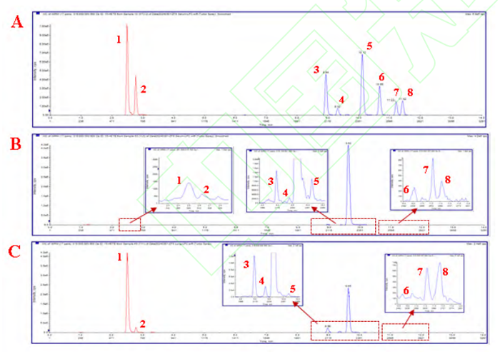 注:A.對(duì)照品;B.血清;C.肺組織;1.PGE2;2. PGD2;3. 15-HETE;4. 11(S)-HETE;5. 5-HETE;6. 14,15-EET;7. 11,12-EET;8. 8,9- EET