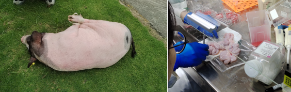 3、香豬解剖后,取出肝臟、卵巢、子宮、胰腺放入有類器官緩沖液的培養皿中,放在冰上。