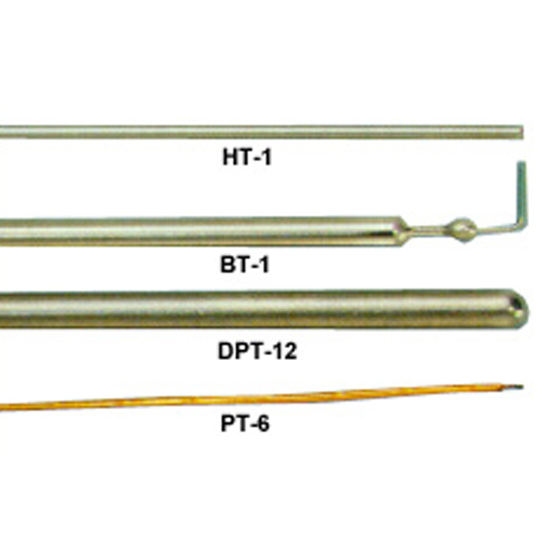 BT-1 –用于探測固體的表面溫度,也用于探測液體,氣體和半固態物體。也許是我們最好的通用探測器。焊接不銹鋼軸、塑柄。頂部是 .02"直徑的直角彎探頭,方便準確地進行表面測量。 5 英尺。 渾然一體。.最高頂部溫度 240°C。時間常數0.15 秒。 不是獨立的。