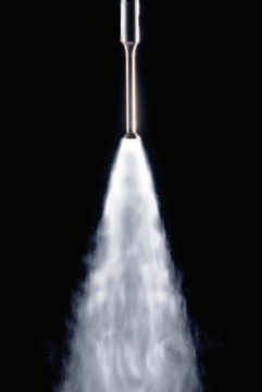 霧化的物料量可低至2 μl /秒。因為液滴通常以低速向下漂移在重力的影響下,應將探頭安裝時使探頭的尖端朝下,并保持空氣湍流。最小以減輕噴霧圖案變形。低速空氣和折流板可用于將噴霧夾帶到特定位置區。各種涂料,化學藥品,潤滑劑和顆粒懸浮液都可以輕易霧化。但是,諸如粘度,混溶性和固體含量之類的因素值得考慮。為獲得最佳霧化效果,粘度應 低于500 cps,固體濃度保持在30%以下。因為霧化過程取決于使液膜運動,所以通常粘度越高–流速越低,應用越困難。含有長鏈聚合物分子的液體的霧化即使是稀釋形式也存在問題,因為材料的內聚性。在許多情況下,可以將與微粒的混合物霧化,因為固體很簡單隨身攜帶。液體通過探頭的傳輸速度低,甚至可以研磨磨料漿 處理過的通道侵蝕可忽略不計。與常規加壓噴嘴相比,進料通道穿過探針和出口孔的通道相對較大,并且實際上是不可堵塞的。液滴大小主要是功能頻率和水的作用下,40kHz時的中值液滴尺寸約為50微米。