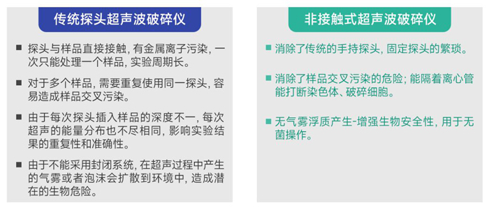 非接觸式樣品可在密閉容器下進行破碎,不產生感染性飛霧,超聲探頭與樣品不接觸,避免交叉污染。對于每天要處理多個樣品或者貴重樣品的實驗室,非接觸超聲波DNA破碎儀具有處理高通量,樣本低損耗無交叉污染等優勢。逐漸成為ChIP(染色質免疫共沉淀)和DNA剪切研究平臺不可缺少的標準化工具。