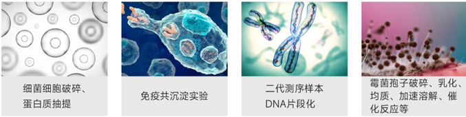 通過壓電轉換器,將電信號轉變為高頻聲波信號,產生數百萬的分子“空穴”,利用“空穴”在幾秒內變大、破裂產生的瞬時流體剪切力,通過等溫、非接觸的方式對樣本進行打斷、勻漿和混合。